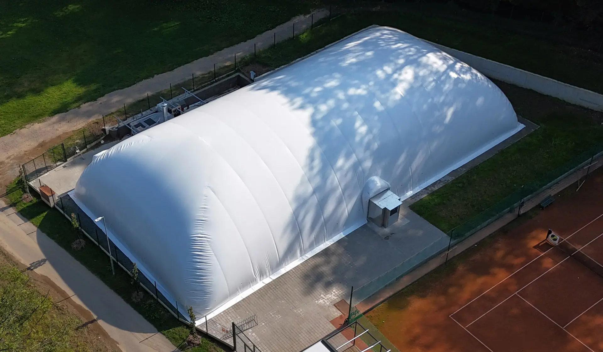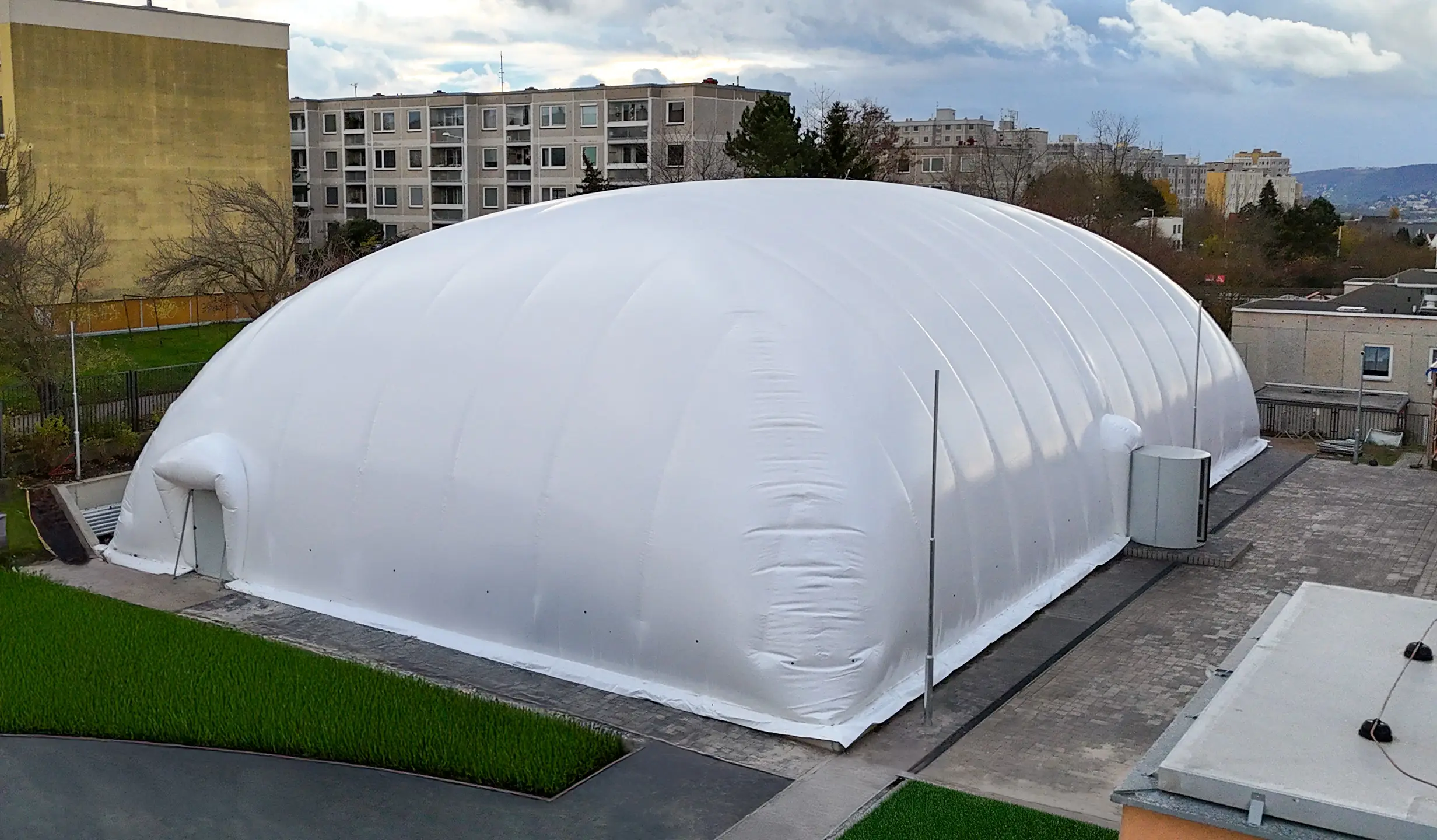 Oferujemy dostawę i montaż hal pneumatycznych wykonanych w technologii membrany dwupowłokowej, bezlinowej, zgrzewanej (spawanej) wysoką częstotliwością w zakresie wszystkich elementów powłoki. Realizujemy pełen zakres robót w skład, których wchodzą instalacje elektryczne, oprawy oświetlenia głównego i awaryjnego, urządzenia nadmuchowo – grzewcze, drzwi obrotowe i ewakuacyjne oraz śluzy techniczne – transportowe i ewakuacyjne.